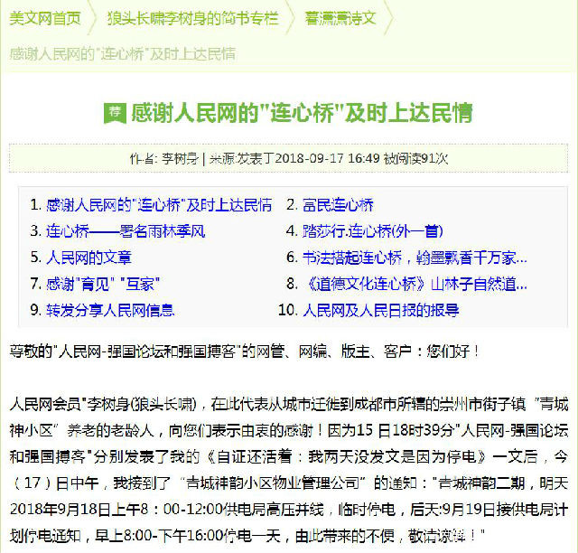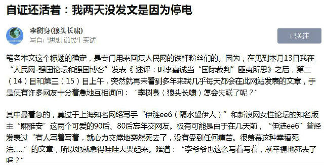 其中,最早發表的應是2018年9月15日和17日,分別發表在人民網-強國論壇、博客中國-作家專欄、華聲論壇-辣眼時評李樹身狼頭長嘯專欄、簡書網-狼頭長嘯李樹身專欄,以及知乎網-李樹身狼頭長嘯專欄等著名論壇、博客上的《自證還活着:我兩天沒發文是因為停電》和《感謝人民網的"連心橋"及時上達民情》兩篇文章,在互聯網上傳播甚廣。