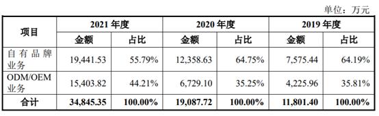 與此同時,渡遠户外的的代工業務佔比攀升,或許也在一定程度上壓低了主營業務的毛利率。2021年度,渡遠户外自有品牌業務收入1.94億,佔比總收入的55.79%;ODM/OEM業務收入1.54億,佔比總收入的44.21%,較去年佔比的35.25%有較大提升。