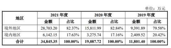 或是因為上述原因,渡遠户外將市場看向國外。報告期內,渡遠户外實現境外主營業務銷售收入分別為0.94億元、1.58億元及2.87億元,分別佔主營業務收入的79.58%、82.84%和82.37%。