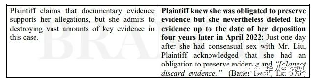 劉靜堯的律師出示了以下證據,以證明劉強東和京東在明知劉靜堯從未表達同意(denied and/or withheld consent)的前提下的性侵行為,屬於蓄意忽略她的權利和安全,符合懲罰性賠償的條件。 證據包括: