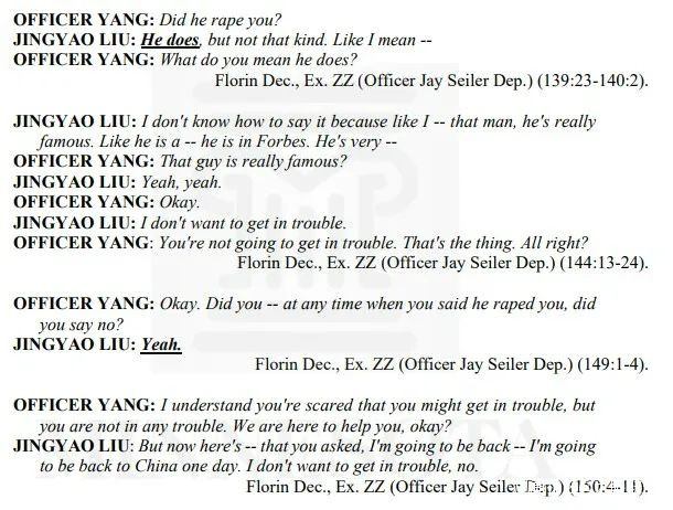 證詞中,警方詢問“在他強姦你的時候,你有沒有在這個過程中説過不要?”劉靜堯表示“説過。“