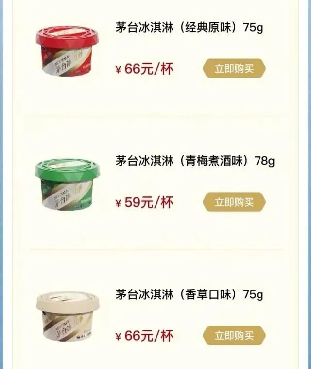 最近,連茅台也推出“茅台冰淇淋”,售價59元和66元。售價66元的兩款冰淇淋中,都添加了2%的53度貴州茅台酒。上線當日,51分鐘賣光了4萬多件。
