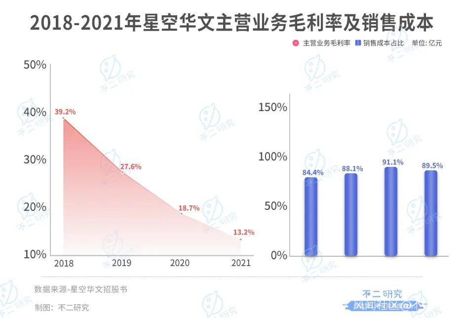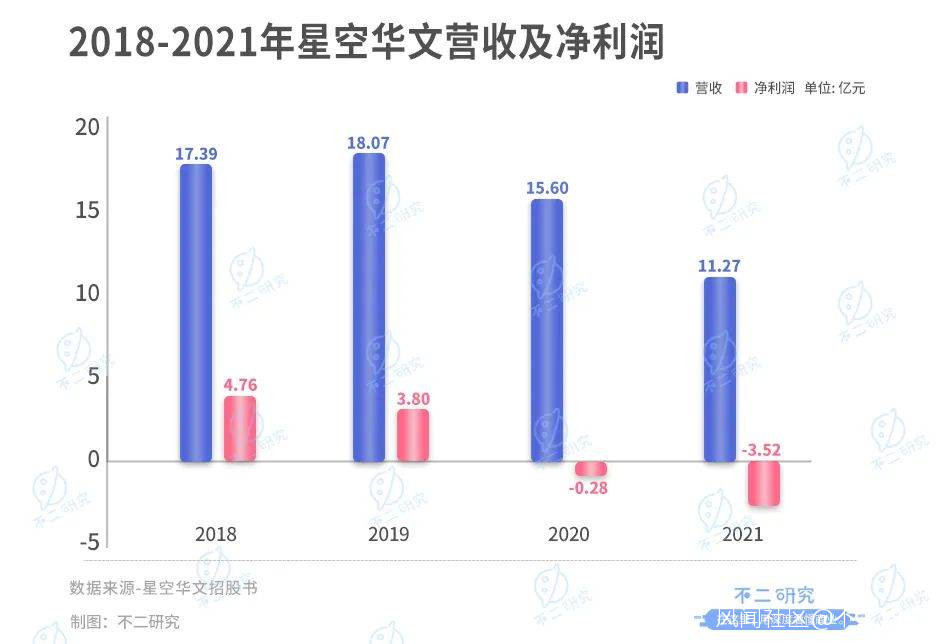 據招股書顯示,2018-2021年,星空華文的收入分別為17.39億元、18.07億元、15.60億元和11.27億元。其中2020年和2021年營收分別同比下降13.67%和27.77%。