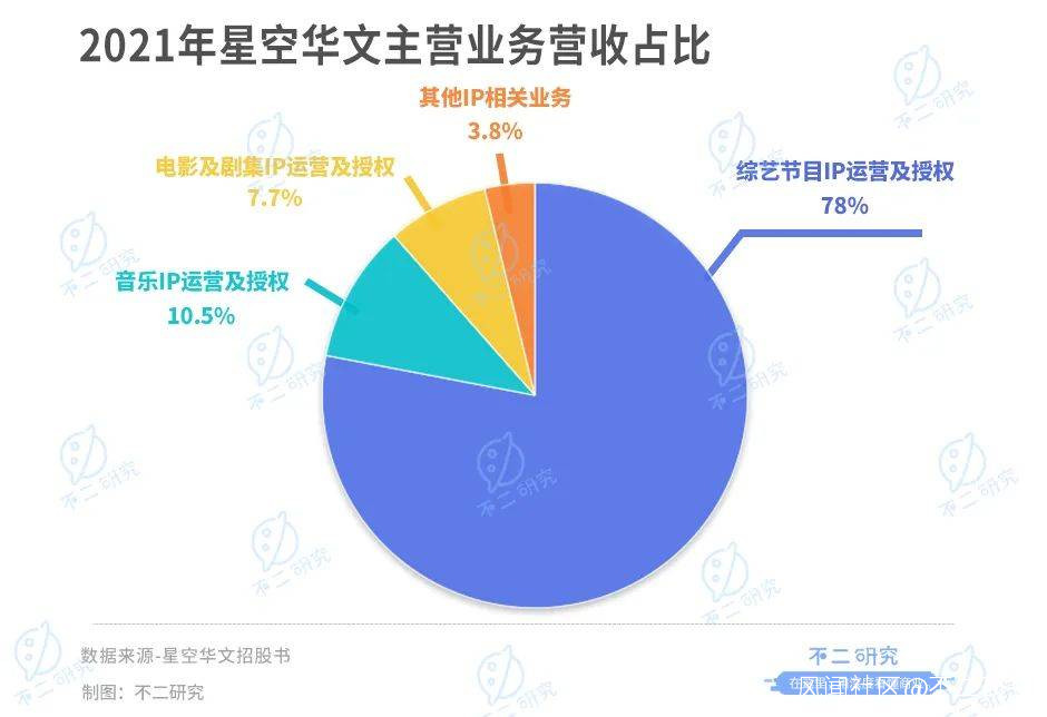 星空華文的主營業務分為綜藝節目IP運營及授權、音樂IP及授權、電影及劇集IP運營及授權和其他IP相關業務。其營收在2021年分別佔總營收比重78%、10.5%、7.7%和3.8%。