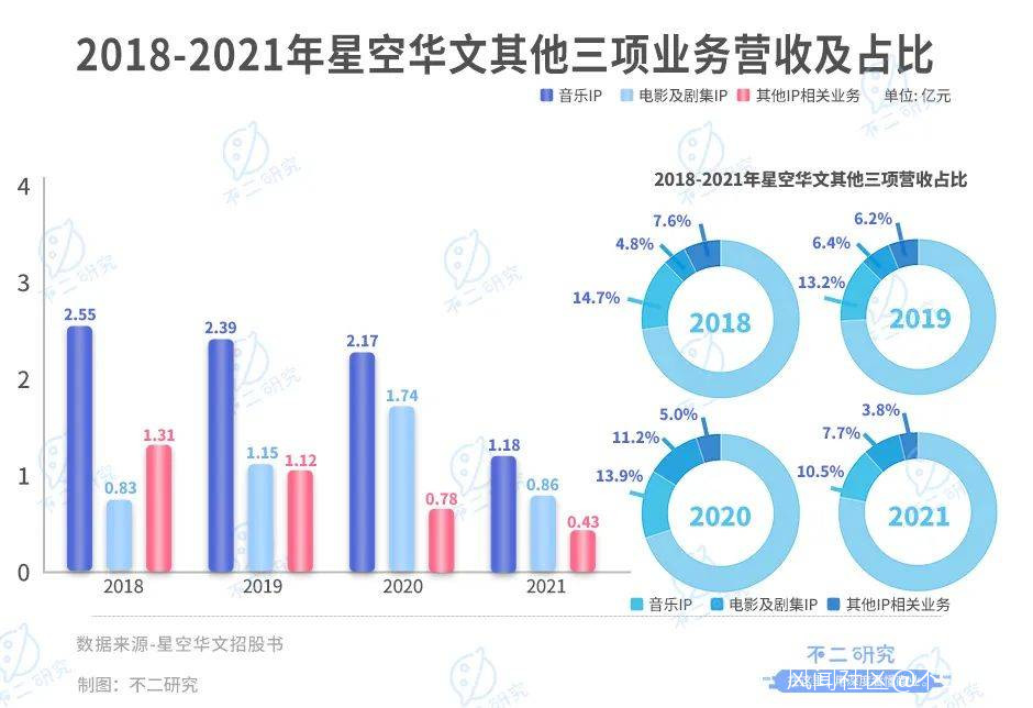 音樂IP及授權業務2018-2021年營收分別為2.55億元、2.39億元、2.17億元和1.18億元;分別佔總營收的14.7%、13.2%、13.9%和10.5%。