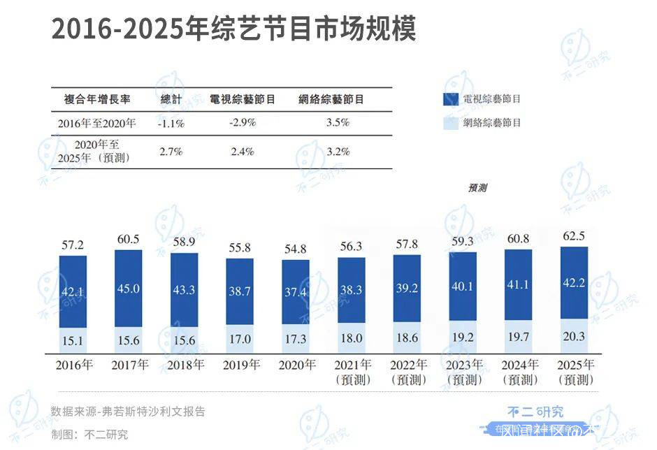 從整體電視綜藝節目市場觀察,據弗若斯特沙利文報告,2016-2020年,電視綜藝節目市場複合年增長率下降2.9%,但以IP為中心的內容運營的進一步發展可能給該市場帶來新的增長潛力。預計該市場的複合年增長率將於2020-2025年期間保持穩定,約為2.4%,至2025年將達至約422億元。