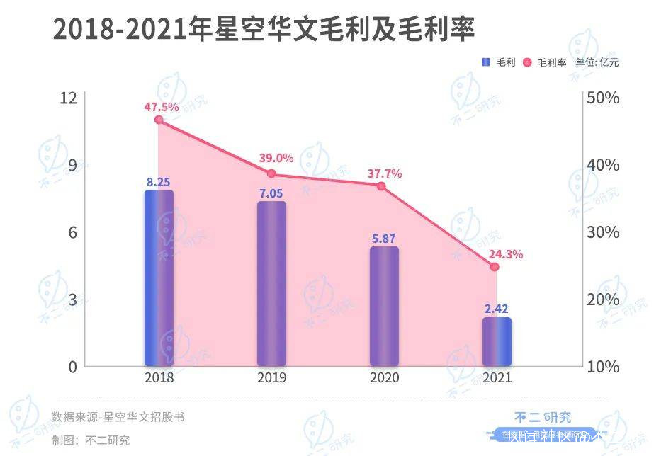 與此同時,毛利及毛利率的情況也不樂觀。2018-2021年,星空華文的毛利分別為8.25億元、7.05億元、5.87億元和2.74億元;毛利率分別為47.5%、39.0%、37.7%和24.3%。
