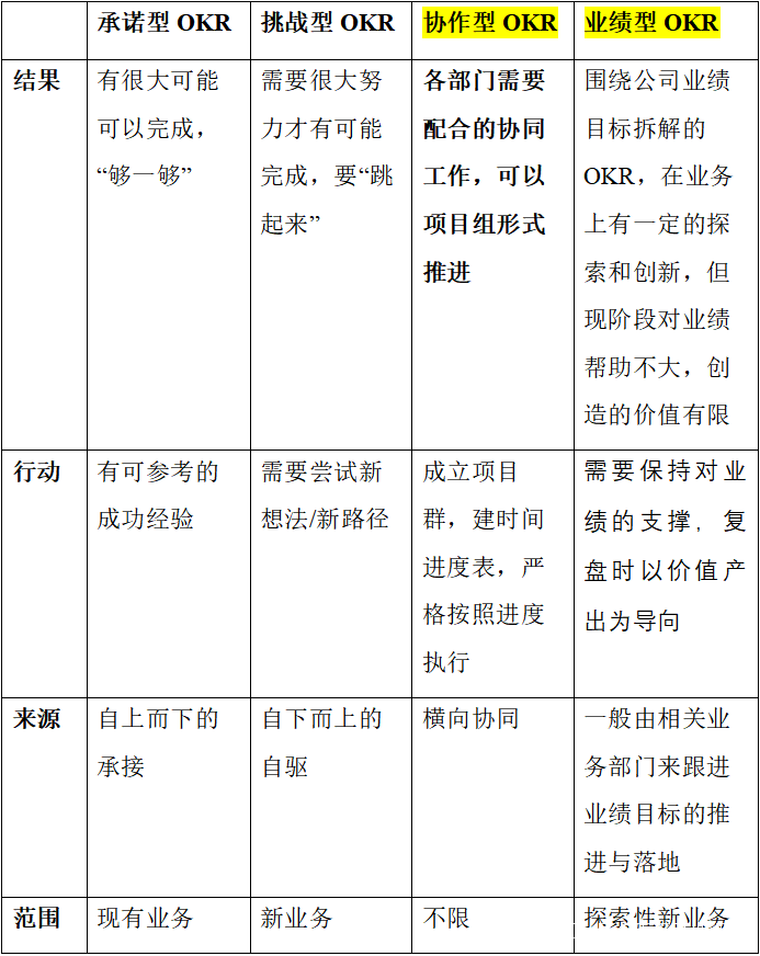 天然工坊實施的4種OKR類型,來源:《OKR實踐手冊》,姚瓊