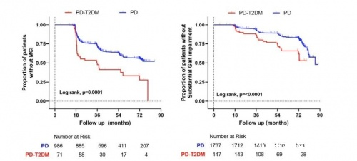 此外,隨着時間的推移,與PD組相比,T2DM患者的運動症狀進展明顯加快(P = 0.012),情緒症狀惡化(P = 0.041),並且更有可能出現實質性步態障礙(危險比,1.55;CI:1.07-2.23;P = 0.020)和輕度認知障礙(危險比,1.7;CI:1.24-2.51;P = 0.002)。該研究的重要意義在於發現了:T2DM與帕金森病的疾病進展速度有關,突出了這兩種疾病之間的互動。因為它是一種潛在的可改變的代謝狀態,有多個外周和中樞的干預目標,它可能是緩解帕金森病症狀和延緩殘疾和痴呆進展的目標。