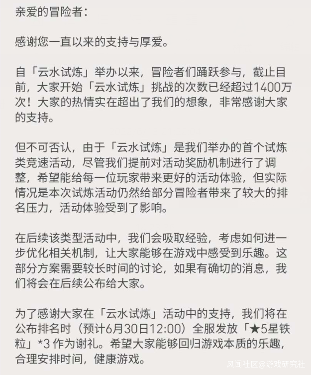 到了這一步,國服的運營也發現有點不太對勁了。根據他們在活動結束兩天前發佈的公告來看,國服挑戰雲水試煉的總次數在短短一週之內超過了1400萬次,被嚇傻了的官方趕緊全服發放獎勵,希望大家能“迴歸遊戲本質的樂趣”,