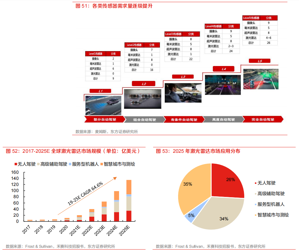 **多傳感器融合大勢所趨,激光雷達必不可少。**作為自動駕駛的傳感器之一,激光雷達以激光作為載波,波長比毫米波更短,探測精度高、距離遠。不過受限於技術難度大、成本高,目前還未實現大規模裝車。為了實現無人駕駛功能性與安全性的全面覆蓋,傳感器的融合與冗餘將成為未來的主旋律,激光雷達作為探測精度、分辨率更高的關鍵一環,伴隨其工藝的不斷成熟,成本的逐漸下探,其將在 L3 及以上車型實現規模化裝車應用。另一方面隨着 Robotaxi/Robotruck 的商業化落地,未來該領域的車隊規模將加速擴大。沙利文研究預計,至2025年新落地車隊規模將突破60 萬輛,給激光雷達的應用帶來廣闊下游空間,二者將共同驅動激光雷達市場迎來繁榮。沙利文研究預計,至 25 年全球激光雷達市場規模為 135 億美元,19-25E CAGR 65%;其中無人駕駛和ADAS 領域市場規模將分別增至 35/46 億美元,19-25E CAGR 為 81%/84%,將佔激光雷達總規模的約 6 成。