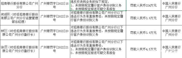 因對未按照規定履行客户身份識別義務、未按照規定報送可疑交易報告違法行為負有直接責任,時任招商銀行廣州分行副行長徐某,被罰款人民幣4.5萬元。