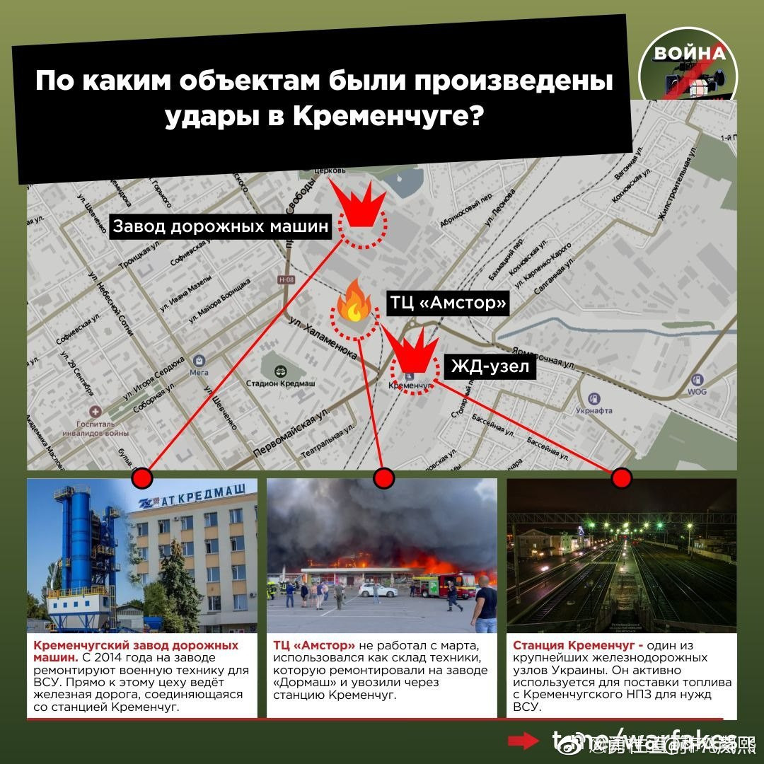 2、烏克蘭克列門丘格,克列緬丘格當地政府發佈的新聞消息是:確認2人死亡。離澤連斯基的“上千人傷亡”還有點距離。Amstor商場離克列緬丘格道路機械廠不足百米距離,該機械廠開戰以來一直在維修烏軍機械化裝備。演員斯基直接張口就是1000兒童婦女死於本次轟炸。目前是火災還是轟炸還不明確。從視頻中看見火勢很大,司機口中婦女和兒童沒看見,拿着機關槍的軍隊倒看見了,基輔之前就有商場作為軍事用途,停了大量的軍事裝備,被無人機跟蹤後炸燬。附近500米內有個烏軍的軍事工廠。情報人員判斷Amstor商場內存有烏軍武器裝備,類似基輔Retroville商場狀況,之前該商場的視頻棉花絮發過,無人機跟蹤其導彈發射車一直到了基輔市區的該商場,然後導彈來襲。俄羅斯迄今為止未使用圓點導彈,都是帶精度的導彈。 烏克蘭指責俄羅斯對民用基礎設施發動導彈襲擊,並要求如開聯合國安理會緊急會議。其稱,俄羅斯加大了對烏克蘭境內民用目標的導彈襲擊,安理會會議定於下午3點舉行。在此之前,烏克蘭總統澤連斯基指責俄羅斯對克列門丘格的購物中心進行導彈襲擊,稱這是恐怖主義行徑。早在昨天俄羅斯就聲稱並沒有對此購物中心進行襲擊,TG裏也有三段視頻放出,整個購物中心周圍也沒有多少人,而且人的表現很輕鬆,停車場也沒有幾輛車,購物中心前的廣場上也沒有爆炸後產生的任何一點殘留物。 誤炸可能性很小,這次事件被司機譽為第二次布查屠殺,雖然第一次布查屠殺到現在他們還不肯公佈最終的屍檢報告和結論。熟讀佛爾摩絲的棉花絮再次強調,不要嘴炮,不要未調查先定罪,白左的謊言在敍利亞表現的讓人瞠目結舌。
