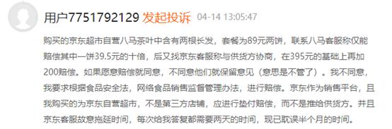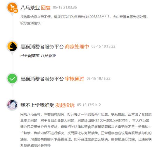 《港灣商業觀察》查詢黑貓投訴發現,對八馬茶業的投訴也主要集中在食品質量方面。有消費者在今年4月14日投訴稱:“購買的京東超市自營八馬茶葉中含有兩根長髮,套餐為89元兩餅,聯繫八馬客服稱僅能賠償其中一餅39.5元的十倍,後又找京東客服稱與供貨方協商,在395元的基礎上再加200賠償。如果願意賠償就同意,不同意他們就保留意見(意思是不管了)。我不同意,我要求根據食品安全法,網絡食品銷售監督管理辦法,進行賠償。京東作為銷售平台,且我購買的為京東自營超市,不是第三方店鋪,應進行墊付賠償,而不是推給供貨方。並且京東客服故意拖延時間,每次給我答覆都需要兩天的時間,現已耽誤半個月的時間。”
