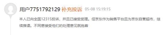 其後,該消費者補充稱,已向全國12315投訴,並且已接受受理。但京東作為銷售平台且為京東自營超市,繼續推諉。不同意接受他們的處理意見就拖着。