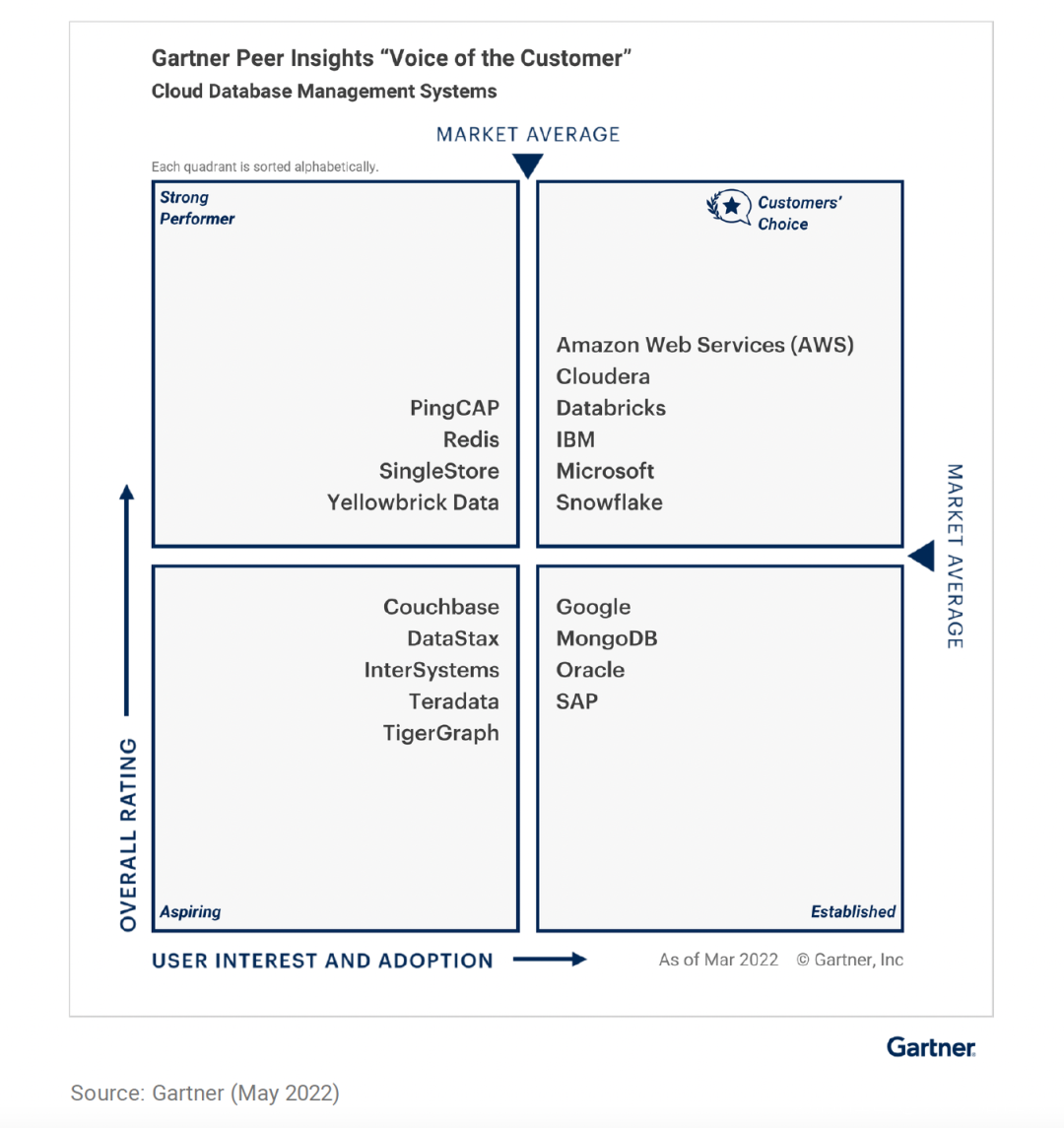 不過,中國數據庫產業界近日終於迎來好消息:全球權威諮詢機構Gartner發佈雲數據庫市場領域 2022 Gartner Peer Insights ‘Voice of the Customer’(用户之聲)報告,PingCAP成為唯一入選的中國分佈式雲數據庫服務商,並且客户總體評分達到 4.7 分(滿分 5 分),位列第一。