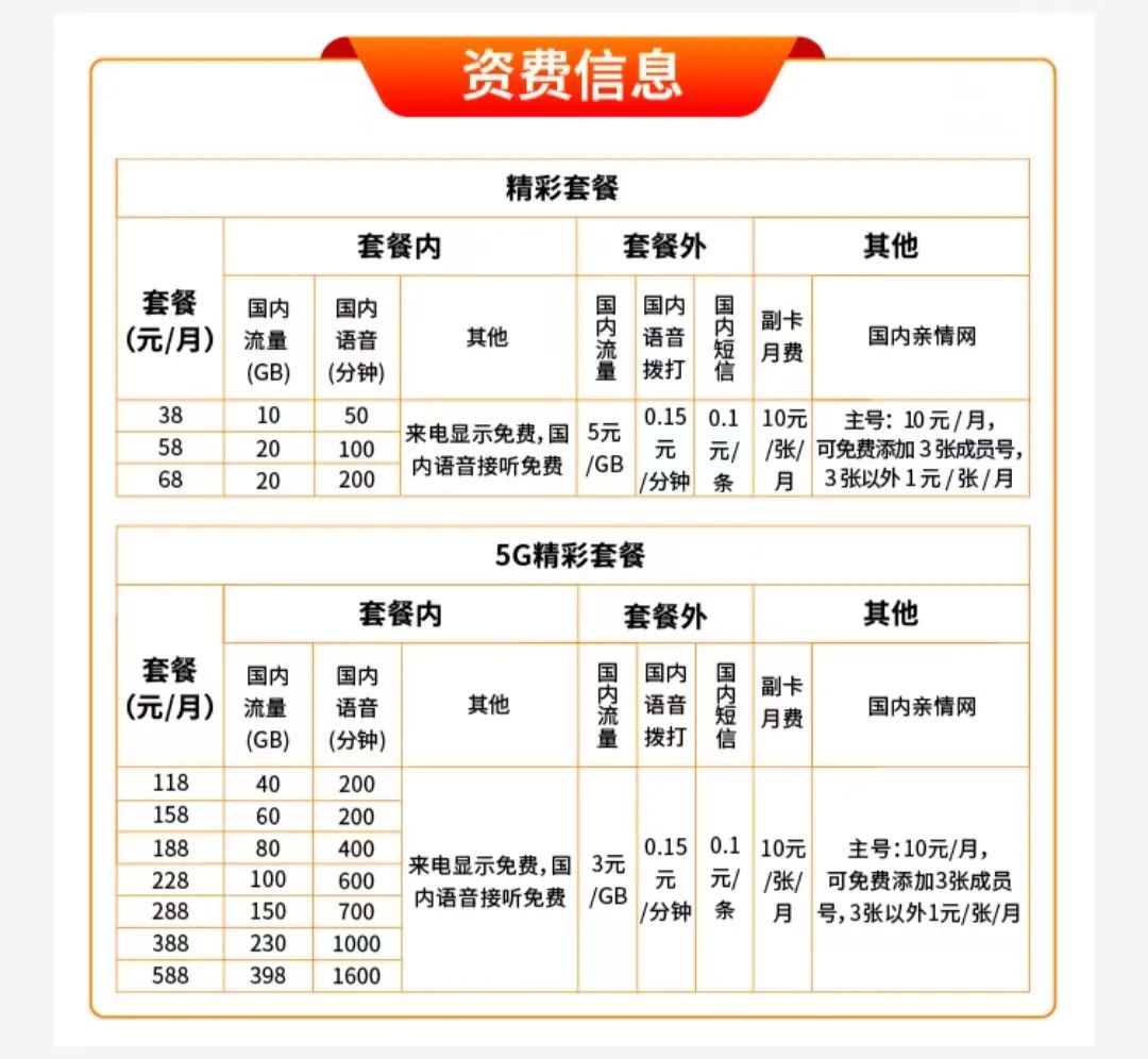 中國廣電的套餐分為兩類,“精彩套餐”和“5G精彩套餐”,前者門檻低主打“經濟、實用、高性價比”,後者門檻相對較高,主打“超大流量”。中國廣電此次推出的套餐共計10檔,最低月租為38元,包含10GB流量+50分鐘通話時長,最高月租為588元,包含398GB流量和1600分鐘通話時長。