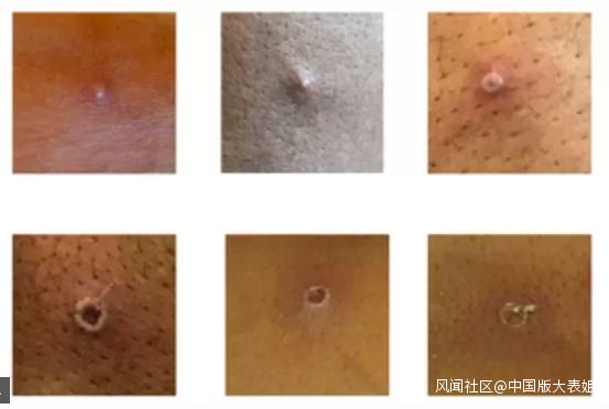 皮疹發展經過不同階段,最終結痂變幹脱落