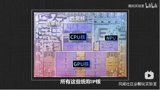 這是最新的蘋果M1pro芯片的版圖,大家可以看到這裏寫的性能核就是負責性能的CPU核,我們常説的大核,效率核就是負責效率的CPU核,小核,這個16核GPU,就是有16個負責圖形處理的核,還有16個NPU就是負責AI計算的核,所有這些統稱IP核。