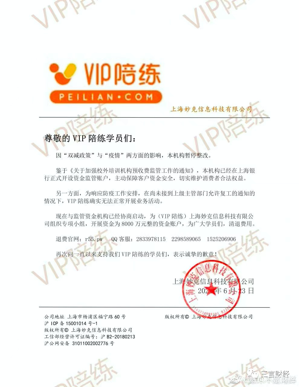 還有一份網傳文件顯示,教育部辦公廳下發文件,VIP陪練責令整改,退費已啓動第三方監管資金。