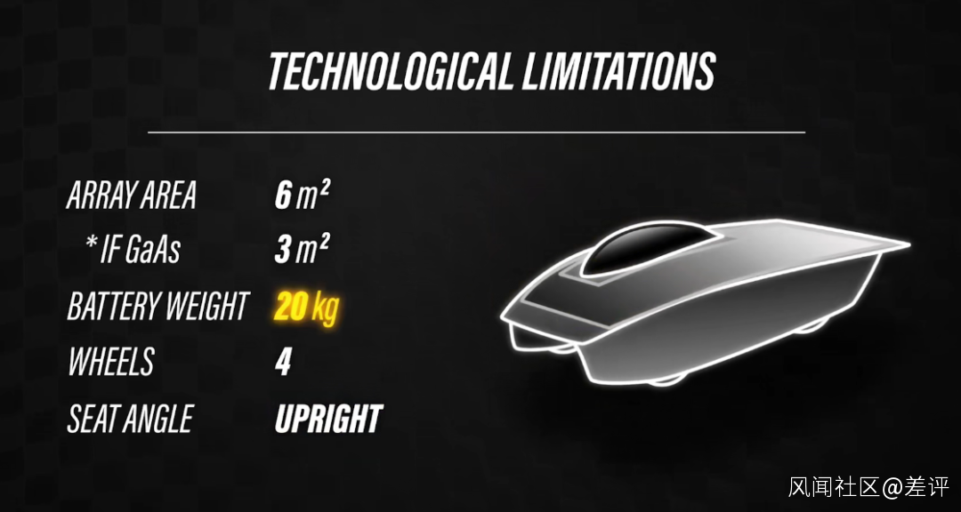 現在的參賽車輛,太陽能板總尺寸不能超過 6 平方米,而且必須考量駕駛員的安全以及車輛實用性,官方也對車輛重量、速度作出限制。