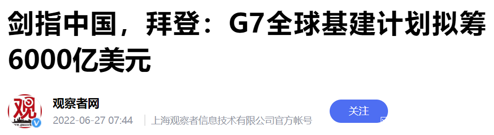 這次七國集團峯會,睡王應該是控制住了竄稀,不斷放炮、吹牛逼。剛宣佈制裁俄黃金,又放炮宣佈七國集團全球基建計劃,號稱5年內眾籌 6000 億美元為發展中國家提供基礎設施資金。