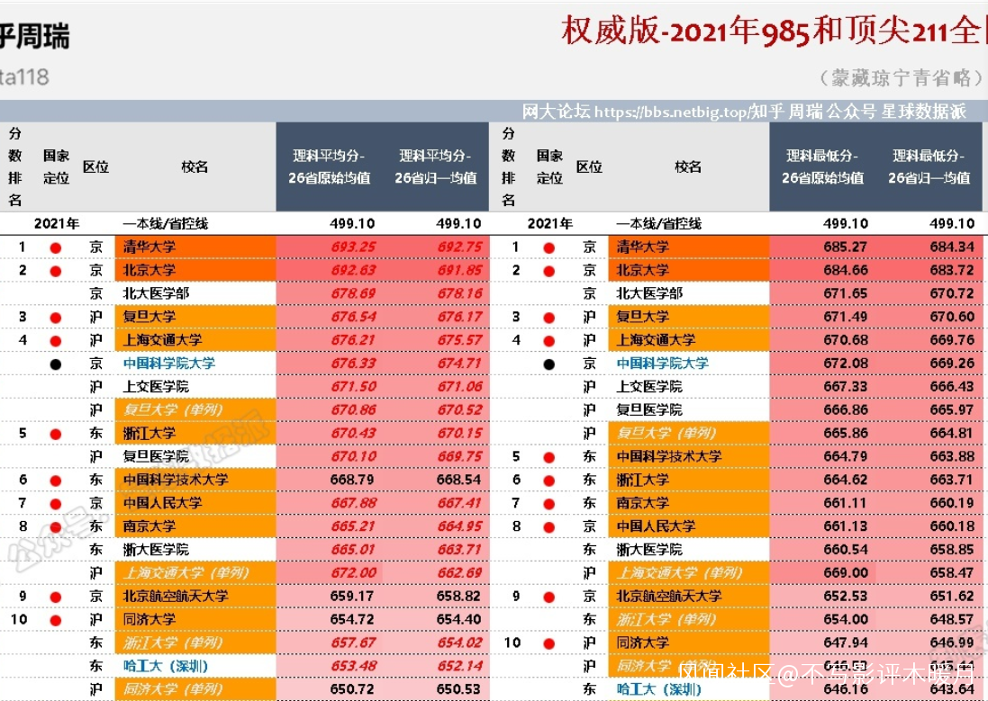 還是2021年,全國26個省各大985高校理科錄取平均分數線(表來自知乎網友 @ 周瑞)