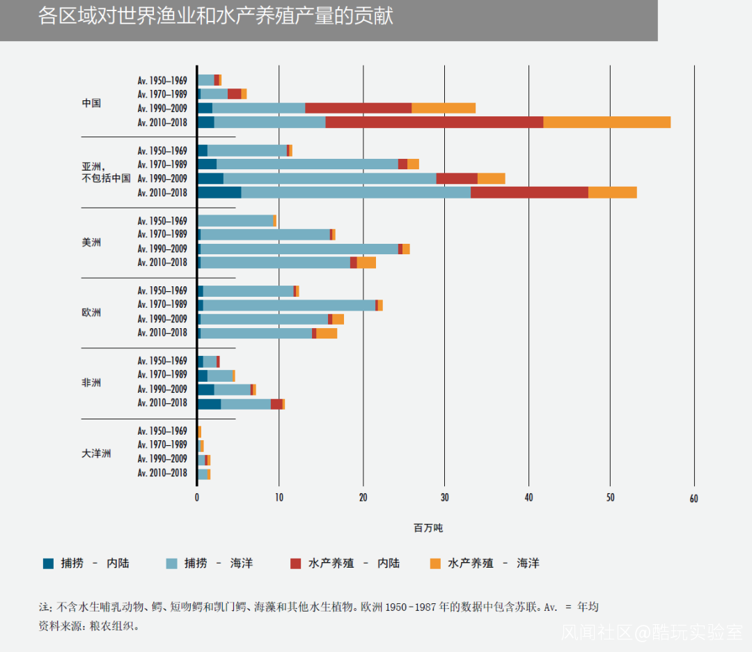 如果仔細觀察聯合國給出的數據,會發現全世界養殖產量佔總量的提升,與中國大力發展漁業的進程一致。