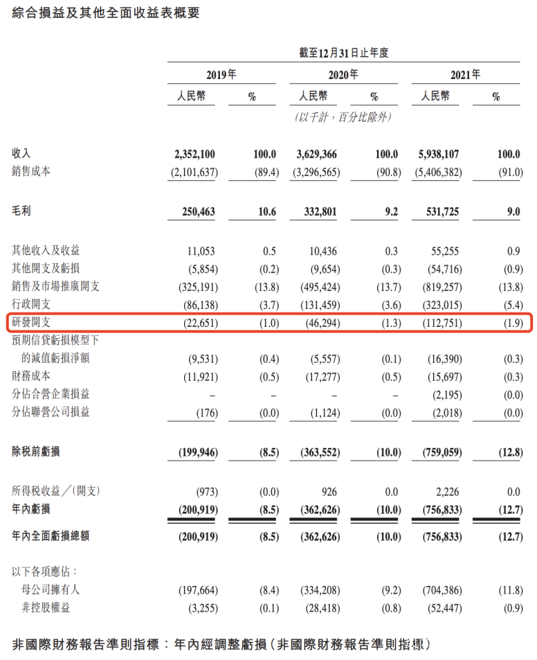 2019年到2021年,在公司營收持續增長的同時,公司虧損也在持續擴大,幾乎每年都在成倍虧損,分別虧損為2.01億元、3.63億元,7.57億元。