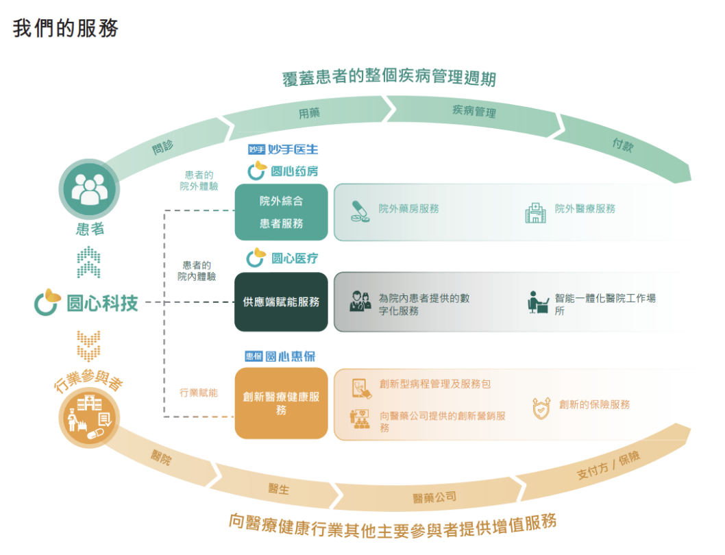 前文提到圓心科技當前主要包括院外綜合患者服務、供給端賦能服務和創新醫療健康服務三大業務板塊。