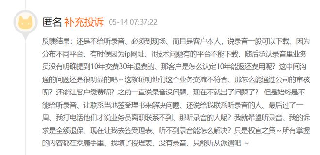 近日,某山西消費者投訴泰康養老誘導投保。其父親兩年前在山西泰康分公司的業務員推薦下購買了“泰康祥雲康順c款保險計劃”,稱10年繳費期滿後可以退還本金及利息,就當存錢一樣。然而,現在業務員卻説要30年才能退,期間雙方溝通了一兩週,完整電話錄音仍被泰康方面以多種理由不給聽。泰康方面還説如果交不起了,可以從原來每月800多改到400多,保額也從原來的20萬降低到10萬元。