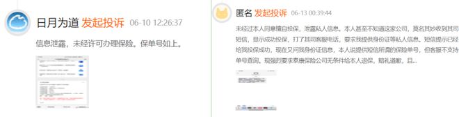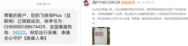 此外,泰康保險還疑似未經本人同意私自投保。有多名消費者投訴稱,在自己毫不知情的情況下收到泰康保險的保單,還有人被誤導註冊領取泰康的“飛鐵保”。