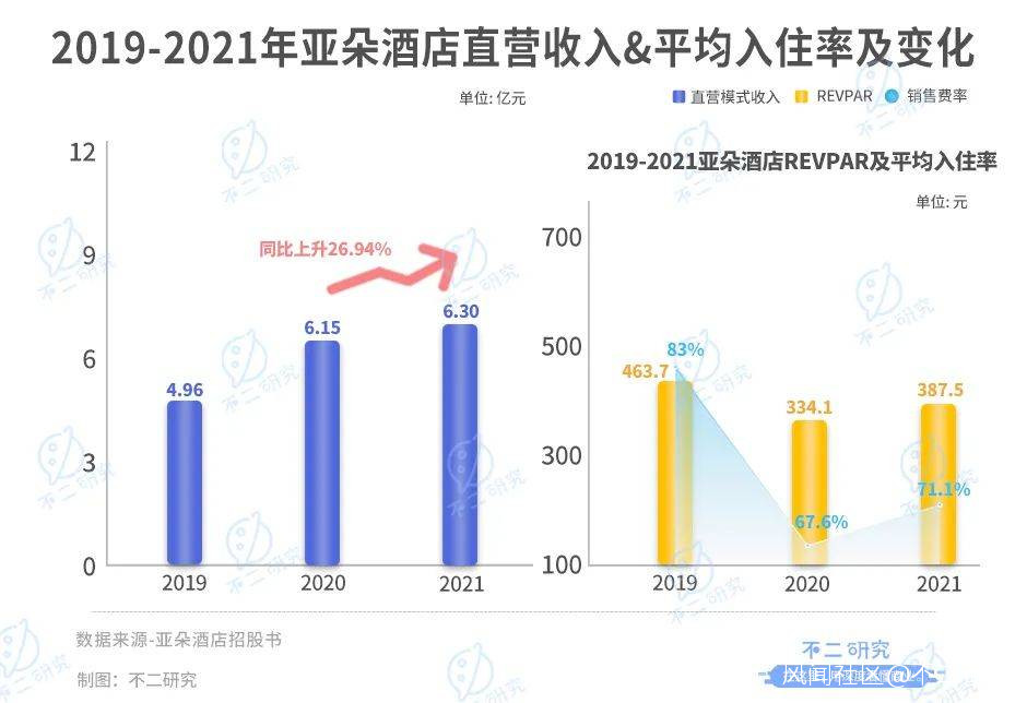 與此同時,亞朵酒店的RevPAR(平均可出租客房收入),從2019年的463.7元跌到2020年的334.1元,下滑幅度達到28%;2021年回升至387.5元。