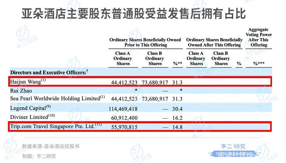 最新招股書披露,王海軍(即耶律胤)持股31.3%,為亞朵的第一大股東;攜程集團持股14.4%,為其第四大股東。