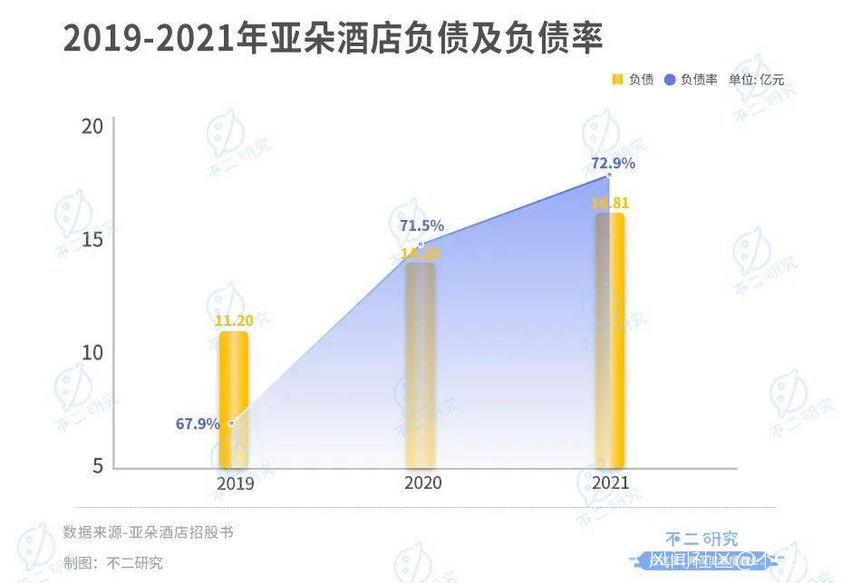 儘管營收、淨利雙雙迴轉,「不二研究」發現亞朵的負債情況並未好轉:2019年-2021年,其總負債分別為11.20億元、14.20億元和16.81億元;同期,其負債率高達67.9%、71.5%和72.9%。