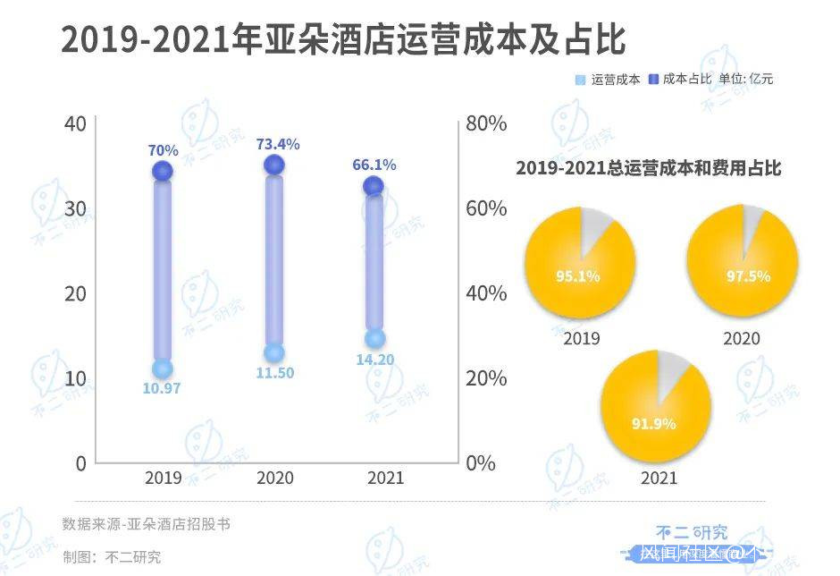 「不二研究」發現,2019年,亞朵的酒店運營成本高達10.97億,總營收佔比70%;2020年達11.50億元,佔亞朵總營收的73.4%。這一佔比在2021上半年也未能有明顯好轉,運營成本14.20億元,依舊高達66.1%。