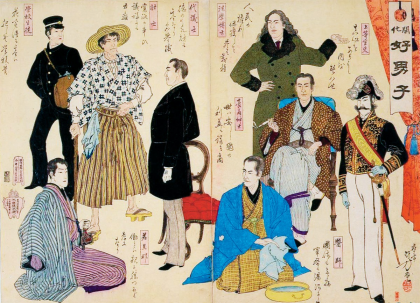 服裝的變化最容易觀察,也讓日本換了個新模樣。明治維新後,規定政府官員、教員等全部改穿西裝(儘管他們回到家中仍穿傳統和服),軍隊和學校也都改穿西式制服。在行政力量的推動下,這一切確實令人感到面目一新。不過,對於日本的這些新變化,當時中國的士人們卻很不以為然,1875 年森有禮與李鴻章的一番對話即具有很強的代表性。