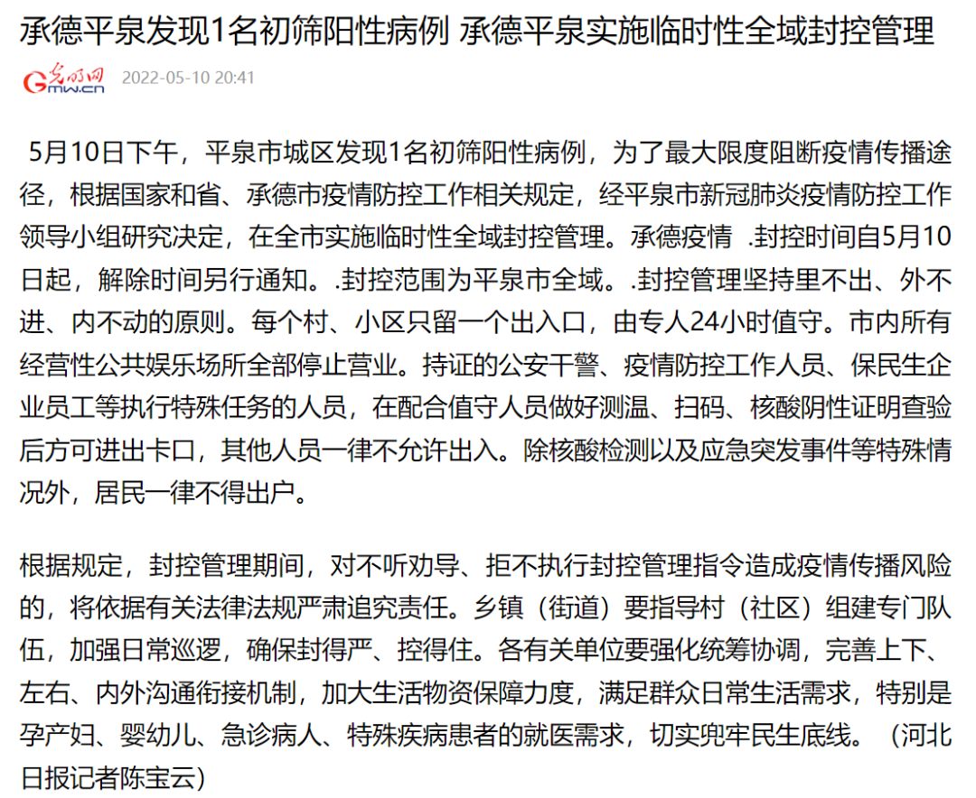 河北日報轉載了平泉市的封控通知,最後一句是: