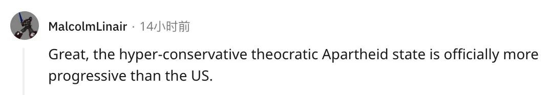 “太好了,超級保守的神權種族隔離國家都比美國更進步了。”