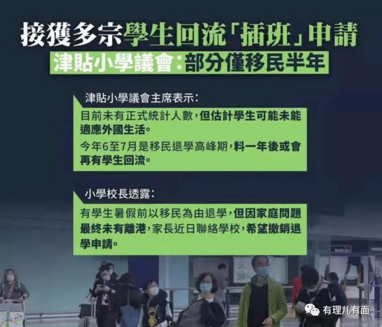 據港媒統計,2020-21學年,香港公立中小學共計收到了近8000名學生的退學申請。然而未到半年,香港於2021年4月就迎來了第一批“迴流潮”,他們的理由基本上都是“孩子不能適應移民後的新生活”。