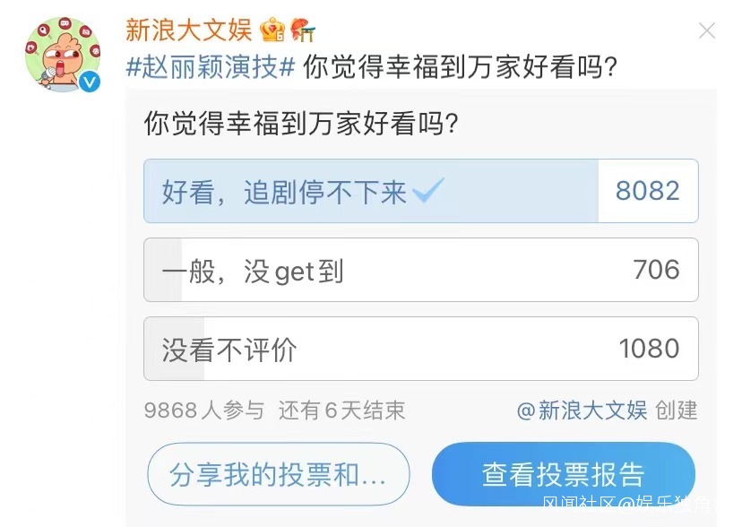 昨晚,由趙麗穎領銜主演的《幸福到萬家》登上北京、東方衞視。首播當晚,該劇拿下雙網實時收視率第一、上線不到一小時全網劇集正片市佔率第一(燈塔),以及#幸福到萬家 氣死# #鬧婚被拍成劇了#等6個相關劇集熱搜話題……目測,該劇有望成為今年暑期檔一大亮點,接棒“六月最熱劇”《夢華錄》。