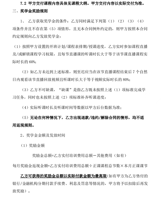 受訪者提供的合同顯示,學員實時參加課程直播且課時長大於等於60%、不存在缺課、未出現退款和違約等情形時,能獲得獎學金。獎金總額以實際付款總金額為最高限。