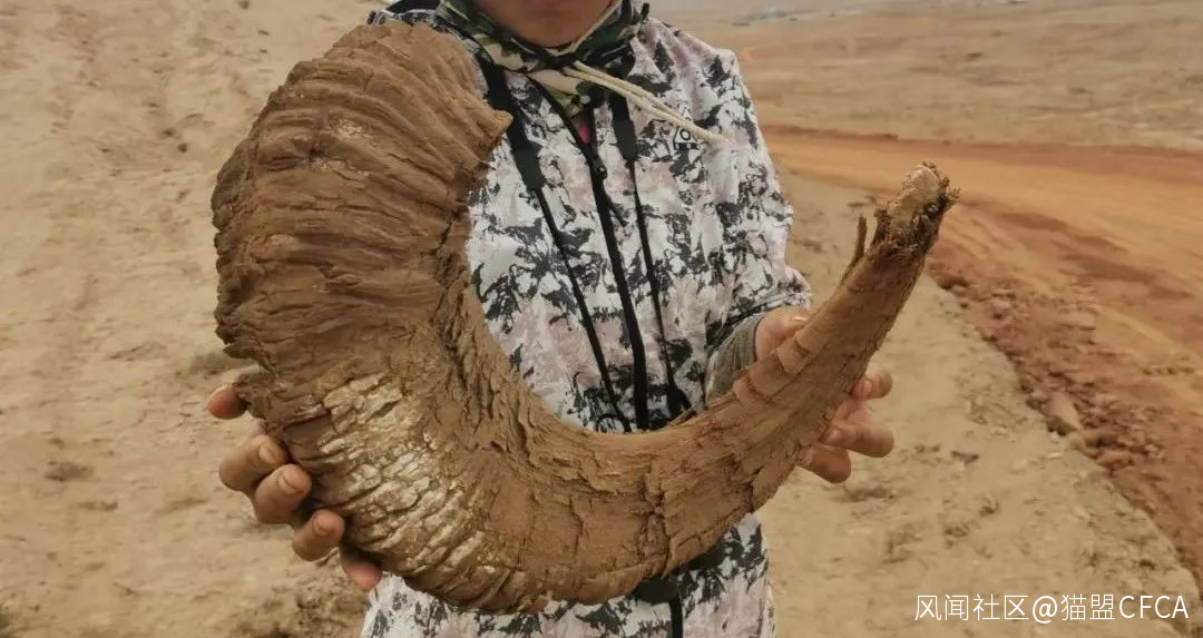 挖掘機轟隆隆開上荒漠山丘,碾碎山脊,土裏埋藏的歷史被揭起——一隻彎曲的大角,這樣的角最可能是盤羊的。