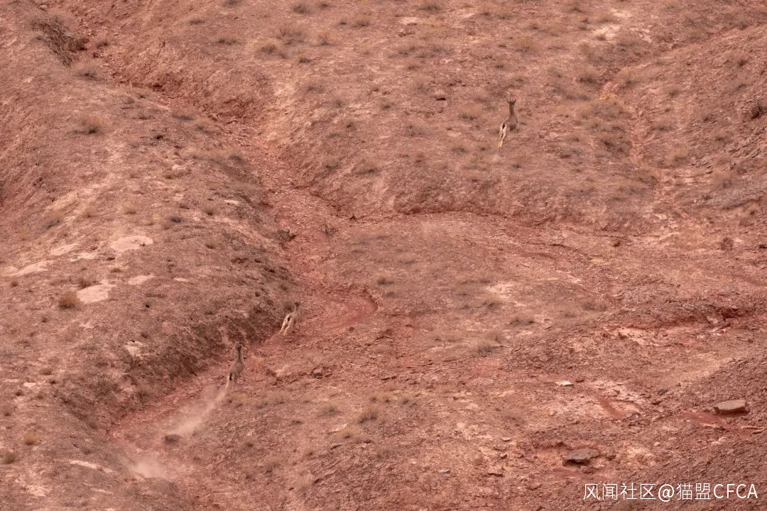 我們在高高的山巔發現了兔猻的痕跡,在山頂俯瞰彩色丘陵,3只鵝喉羚從我們下方的峽谷出逃,消失在沖積平原。我們的紅外相機也數次捕捉到鵝喉羚的影像。