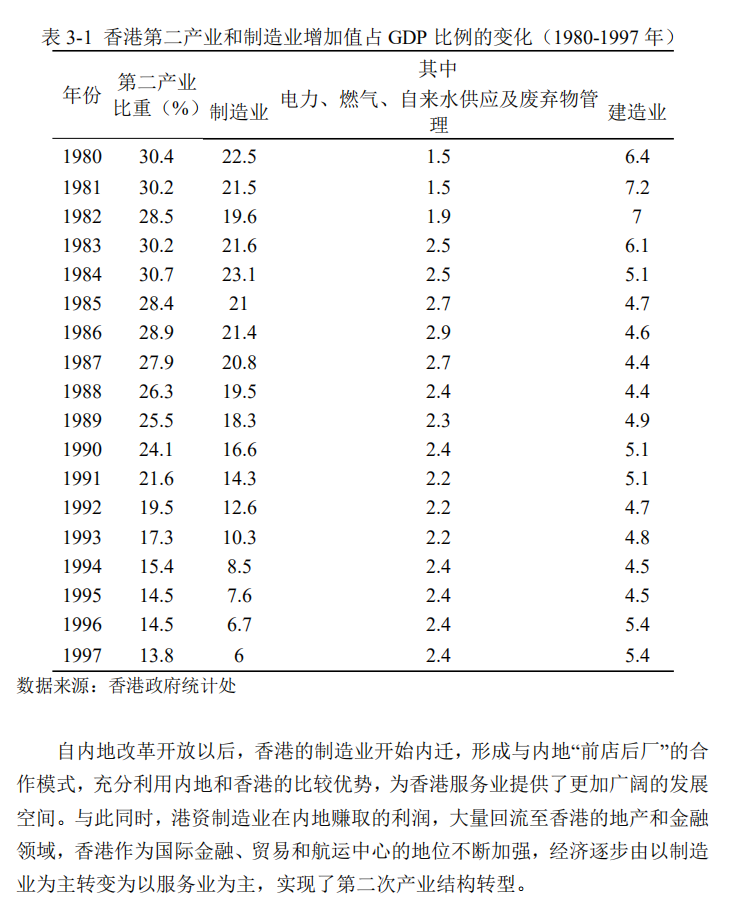 英國人殖民香港之初,並不注重發展工業。新中國成立前,國民黨的資本家大量跑到香港,為發展實業注入資本。但這彈丸之地,又沒有資源,連喝水都要靠內地,顯然搞不了重工業。於是接下來30年,輕紡、塑膠和電子加工,成為香港的製造業支柱,撐起了“亞洲四小龍”的江湖地位。80年代初,香港工業增加值佔到GDP三成,主要就是靠製造業拉動。隨着內地改革開放,深圳特區拔地而起,港資與工廠紛紛“內遷”,搞“前店後場”的合作模式,香港本地製造業逐漸退場。到迴歸前夕,服務業的增加值佔到GDP八成以上,而製造業只有區區6%。今天,除了維他檸檬茶、京都念慈菴這種食品加工產品,還有哪些叫得上名字的“香港製造”呢?歡迎大家在彈幕裏補充。