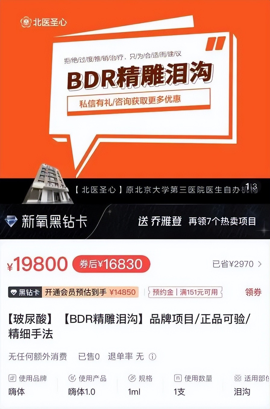 接下來,鋅刻度又在新氧APP上以“愛美客嗨體”為關鍵詞進行搜索,售價最高的一款產品是“BDR精雕淚溝”,標價19800元,券後價格為16830元,使用到的醫美耗材正是1ml的“嗨體1.0”。但其出廠均價為352.61元/支,實際成本才24.72元/支。