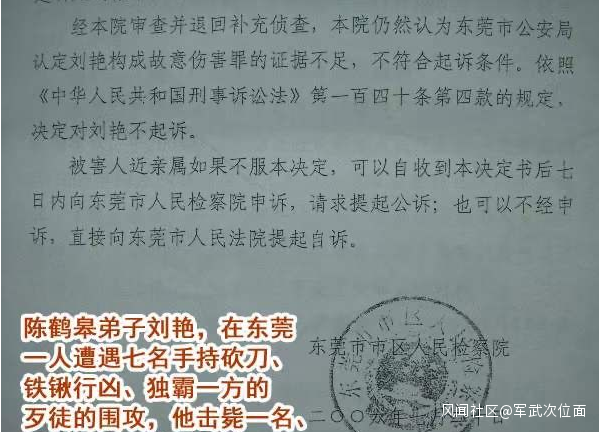 2002年,陳鶴皋弟子劉豔在東莞火車站與7名混混惡戰,這7名社會閒散人員無端挑釁劉豔,甚至手持砍刀、鐵鍬追砍劉豔,這就已經屬於是達到特殊正當防衞的情況了。於是劉豔用恩師陳鶴皋最愛用的剪刀與7名混混一邊跑一邊打,最終劉豔用剪刀打死1人、重傷3人,而東莞市人民檢察院也判定劉豔正當防衞。