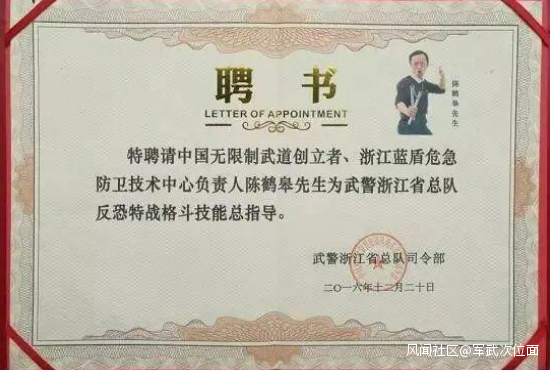 2007年時,陳鶴皋還曾向解放軍某集團軍警衞部隊傳授無限制搶動快打功夫;2009年,陳鶴皋又在浙江省武警總隊擔任反恐特戰格鬥制導教官。不知道以後會不會看到身着星空迷彩的武警在反恐演練中使用踢襠…