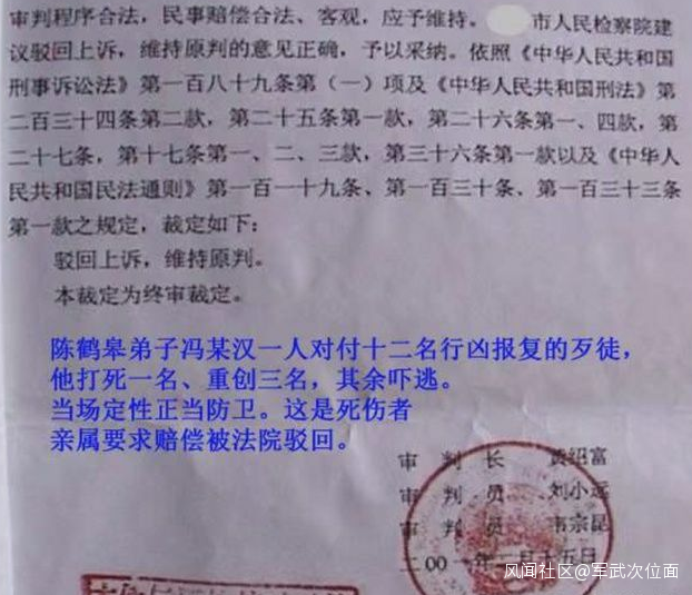 2001年,陳鶴皋弟子馮健漢在農村老家目睹村霸對其家人施暴,想起陳師父講的“瞬間爆發、急促嘯叫、閃身急移、攻防合一”,隻身一人施展無限制格鬥術大展12名惡霸,最終徒手打死1人、重傷2人,嚇尿9人!而後玉林市公安局經調查後判定馮健漢屬於正當防衞,不僅不用坐牢,而且被打的村霸們還得給馮健漢一家賠償醫療費。