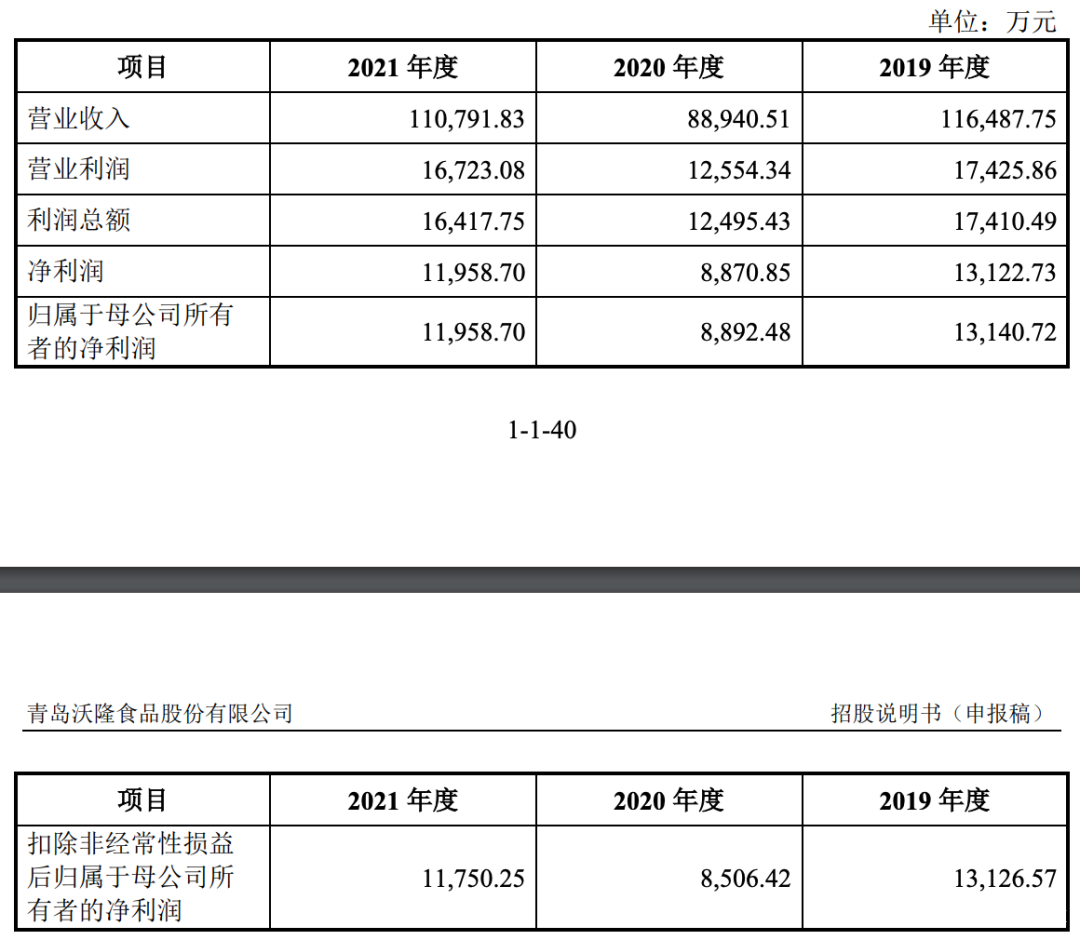 招股書顯示,沃隆食品2019年、2020年和2021年的收入分別為11.65億元、8.89億元和11.08億元;淨利潤分別為1.31億元、8870.85萬元和1.20億元,扣非後淨利潤分別為1.31億元、8506.42萬元和1.18億元。
